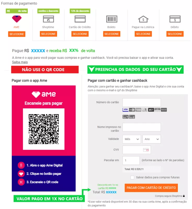 OBS: A cobrança será feita na fatura do cartão da loja. Apenas o cashback aparecerá no AME.