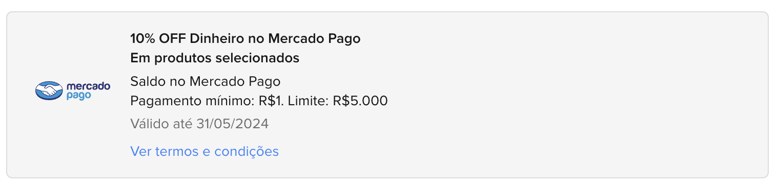 CAMPANHA NÚMERO 10831653. Benefício válido em Mercado Livre do Brasil (i) de 13/05/2024 00:00 a 31/05/2024 23:59, (“Prazo de Vigência”), ambas datas inclusive; ou até alcançar a quantidade de R$ 300000 em descontos concedidos aos Usuários ou até esgotar o estoque de produtos indicados em cada publicação, o que ocorrer primeiro. O benefício consiste em um desconto de 10% em produtos selecionados, aplicados sobre o valor total da compra, sujeito às condições de venda de cada publicação, sempre que o usuário realize a compra com Dinheiro na minha conta do MercadoPago emitido no Brasil pelo undefined. O desconto não se aplica sobre o custo de envio nem sobre outras contratações associadas. Para ser aplicado o desconto, o Usuário deverá aplicar o cupom durante o Prazo de Vigência e verá o desconto refletido no momento de finalizar a compra. O limite de desconto é de R$ 5000 por cupom, com um pagamento mínimo de R$ 1. Cupom pessoal e intransferível, não acumulável com outros cupons e/ou promoções. Os pagamentos com cartão podem ter custos adicionais, para mais informações consulte o emissor do seu cartão. Mercado Pago não é uma instituição financeira. Os fundos em contas de pagamento não são depósitos garantidos. As marcas dos produtos ofertados não são propriedade do Mercado Livre e pertencem a seus respectivos titulares. Quem usar ou tentar usar o cupom declara ter lido e aceitado estes Termos e Condições. Quando o Mercado Livre ou alguma de suas sociedades relacionadas suspeitarem ou detectarem o mau uso do cupom por parte de um Usuário, poderá: (i) suspender a ação, (ii) não fazer valer o desconto, e (iii) iniciar as ações legais que considerar condizentes, sem direito a compensação alguma. eBazar.com.br Ltda., 03.007.331/0001-41. Avenida das Nações Unidas, 3.003, Parte A, Bonfim, Osasco, São Paulo, CEP: 06233-903.