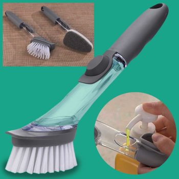 Escova de limpeza 2 em 1 lavar louças estofado panela com recipiente dispenser para detergente