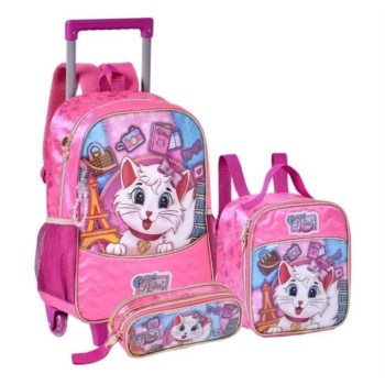 🔥 Kit Escolar Mochila Rodinha Gatinha Meninas Estojo e Lancheira