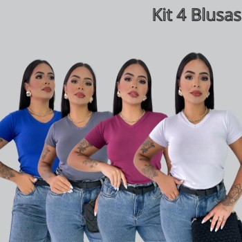 🔥 Kit 4 Blusas Gola V Femininas Manga Curta