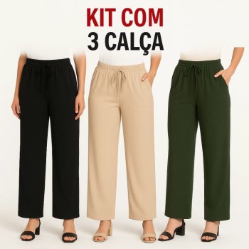 Kit 3 Calças Pantalonas Femininas Cintura Alta Tecido Duna Elegante