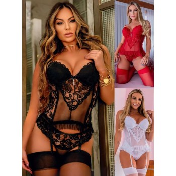 Lingerie Espartilho Corset Sensual Zíper Lateral Completo Renda Delicada Modelador Meia 7/8 Brinde